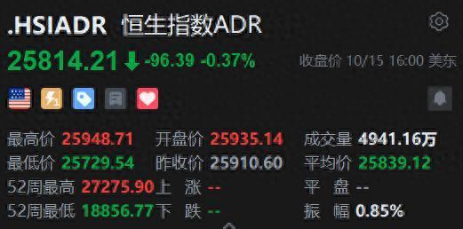 智通财经APP获悉,周三好意思股三大指数涨跌不一。恒生指数ADR着落,按比例缱绻,收报25814.21点开云体育,较香港收市跌96.39点或0.37%。