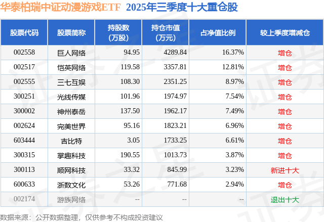 从基金规模来看,华泰柏瑞中证动漫游戏ETF基金2025年三季度公布的基金规模为2.62亿元,较上一期规模1.56亿元变化了1.06亿元,环比变化了68.16%。该基金最新一期金钱成立为:股票占净值比98.7%,无债券类金钱,现款占净值比2.04%。从基金握仓来看,该基金当季前十大股票仓位达76.79%,第一大重仓股为巨东说念主网罗(002558),握仓占比为16.37%。