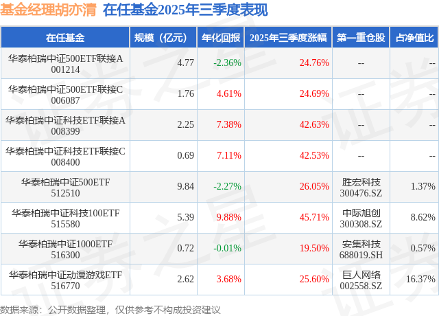 华泰柏瑞中证动漫游戏ETF现任基金司理为胡亦清。其中在职基金司理胡亦清已从业0年又278天,2025年4月1日平安接办措置华泰柏瑞中证动漫游戏ETF,任职时辰累计报恩为28.71%。现在还措置着8只基金家具(包括A类和C类),其中本季度进展最好的基金为华泰柏瑞中证科技100ETF(515580),季度净值涨幅为45.71%。