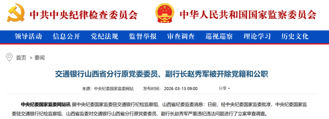 3月13日,中央纪委国度监委官网通报称,交通银行山西省分行原党委委员、副行长赵秀军被开除党籍和公职。
